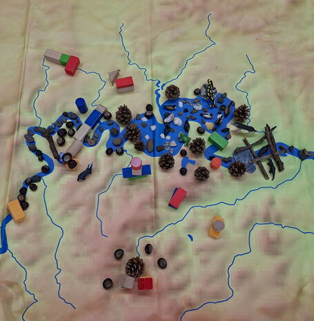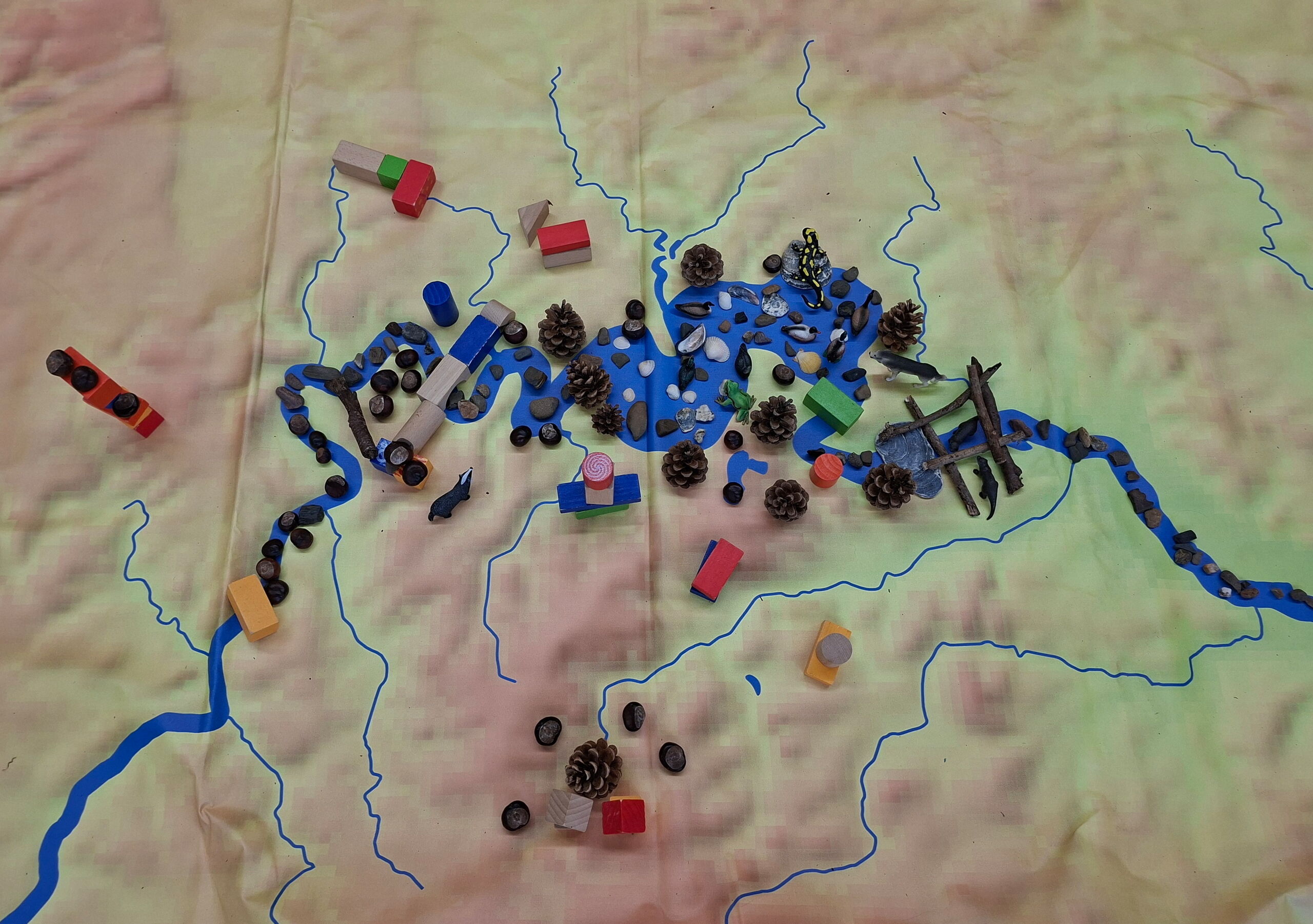Der Geopark GrenzWelten bietet Schulen das BNE-Modul „Steine in Bewegung – Die Kraft des Wassers“ an, das den Schülerinnen und Schülern spielerisch verschiedene Themen der Erde und der Erdgeschichte näherbringt. Mit Naturmaterialien und Tierfiguren gestalten die Schülerinnen und Schüler eine Flusslandschaft am Beispiel der Eder. Im Mittelpunkt steht die erstaunliche Kraft des Wassers: Wie sind die Steine in den Fluss gekommen? Und warum sehen die Steine so unterschiedlich aus? Wie sah es an der Eder in der Eiszeit aus? Die Kinder lernen, dass jeder Stein seine ganz eigene Geschichte erzählt und welche Kräfte eine Landschaft formen.