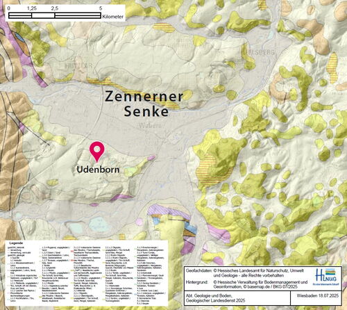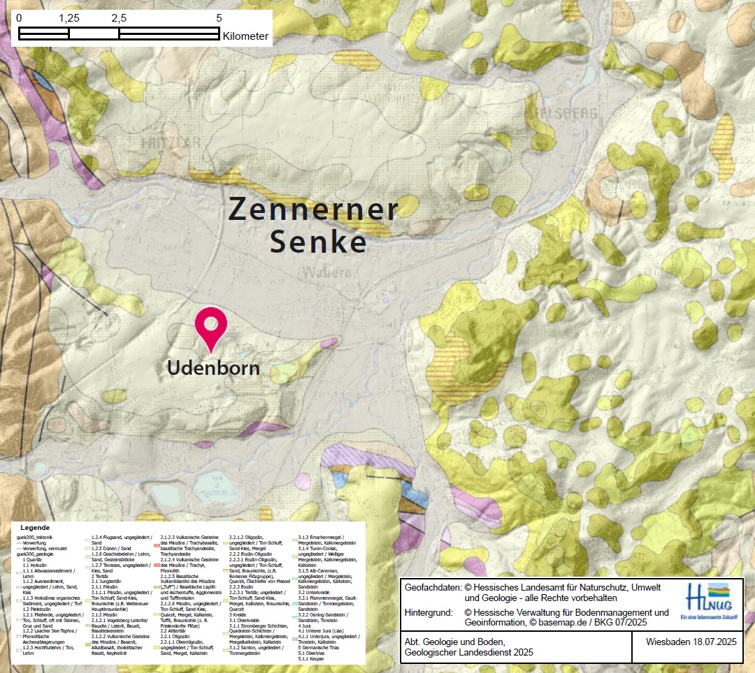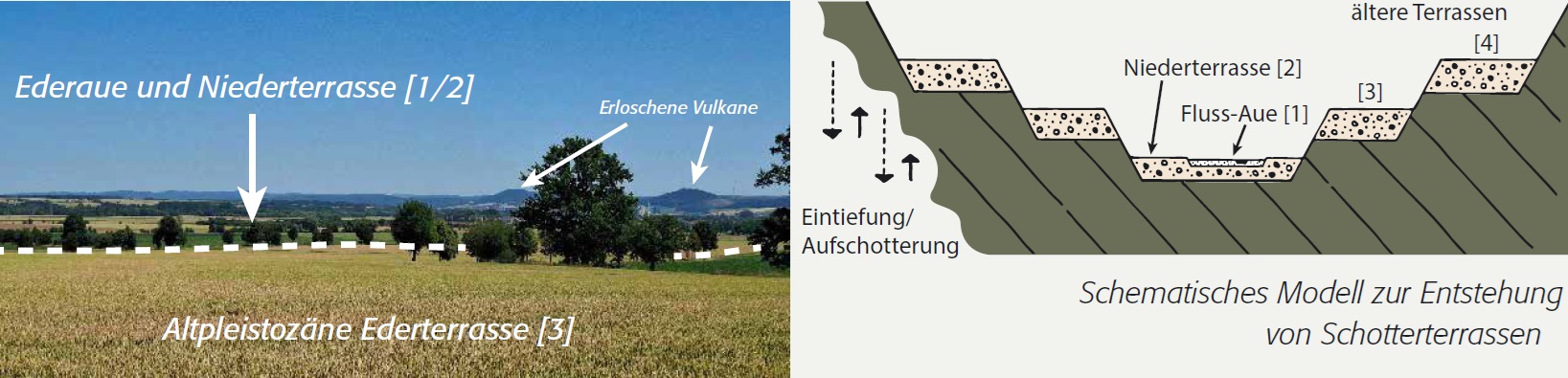 Von Wabern-Udenborn aus hat man eine gute Aussicht auf die Terrassen-Landschaft an der Eder. Flussterrassen in den Mittelgebirgen entstanden im Quartär, also in den letzten 2,6 Millionen Jahren. In dieser Zeit wechselten sich warme (Warmzeiten) und kalte Zeiten (Kaltzeiten) immer wieder ab. Während der Kaltzeiten konnten die Flüsse den vielen Verwitterungsschutt nicht abtransportieren und lagerten ihn ab. In den Übergangsphasen zwischen den Warm- und Kaltzeiten führten sie dagegen mehr Wasser und schnitten sich in die abgelagerten Schuttmassen ein. Dadurch blieben die alten Talböden als "Terrassen" über dem heutigen Flussniveau zurück.