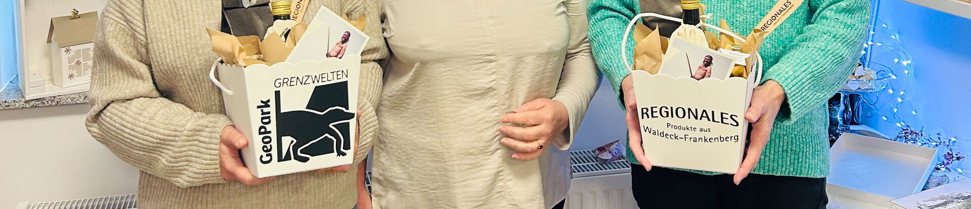 Neben den Köstlichkeiten finden Sie noch kleine Geschenke im Korb, wie der Kochlöffel von Regionales Waldeck-Frankenberg und die Geopark Eiswürfel-Steine!