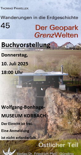 Im Pfeil-Verlag ist in der Reihe „Wanderungen in die Erdgeschichte“ mit dem aktuellen Band jetzt ein Führer über den östlichen Teil des Geoparks GrenzWelten erschienen. Der Autor Thomas Pawellek, ein profunder Kenner der Region, wird gemeinsam mit dem Geopark GrenzWelten sein Buch am 10. Juli um 18:00 im Wolfgang-Bonhage-MUSEUM KORBACH vorstellen. Der Autor wird dafür nach Korbach kommen und einen spannenden Vortrag über die Region und was es dort zu entdecken gibt halten. Im Anschluss gibt es ein Beisammensein mit Getränken, bei dem der Autor und die Experten gerne für Fragen zur Verfügung stehen. Das Buch kann über den Buchhandel bezogen werden (45 Euro) und am Abend vor Ort erworben werden.