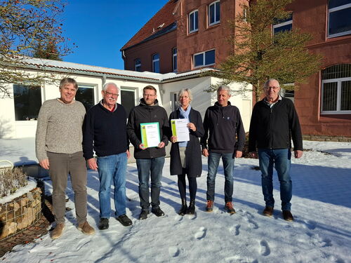 Freuen sich über fachkundigen Zuwachs im engagierten Geoparkteam: Geoparkleiter Dr. Georg Bresser (l.) mit seinen drei Prüferkollegen Michael Hefer (2.v.r.), Manfred Pauly (r.) und Gerd Rosenkranz (2.v.l.) begrüßen Neu-Geoparkführer Martin Mühlenbein und Neu-Geoparkführerin Susanne Henke-Skroch.