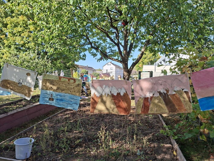 Bei strahlendem Sonnenschein fand im Schulgarten der Grundschule Neuer Garten in Bad Arolsen der Workshop des Geoparks GrenzWelten zum Thema „Künstlerisches Gestalten mit Erdfarben“ für Kinder statt. Die Künstlerin Gerlinde Vestweber hatte das Material mitgebracht: Leinwände, Farben, Binder, Erdfarben, Pigmente und Holzrahmen. Das Team vor Ort hatte den Garten der Schule vorbereitet: Tische und Bänke waren aufgestellt und Wäscheleinen zwischen den Bäumen gespannt. Lehrkräfte und Eltern waren zur Unterstützung dabei.
