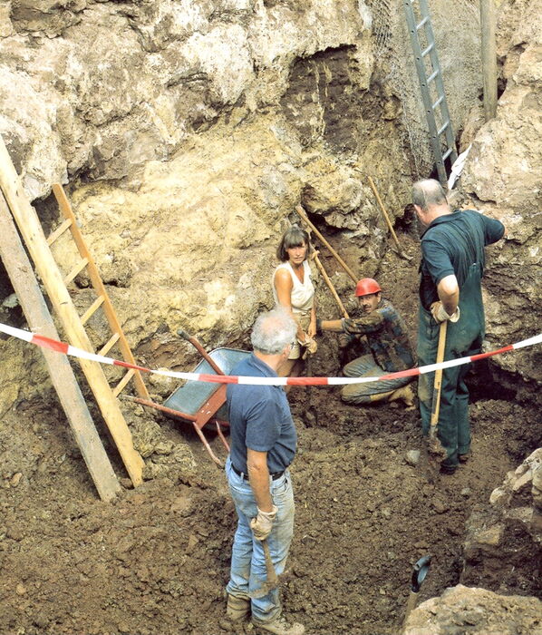Foto: Nach ihm wurde eine bislang unbekannte Art benannt: Entdecker Dr. Jens Kulick (Vordergrund, mit dem Rücken zur Kamera) an der Fossilfundstätte Korbacher Spalte, dem Fundort des „Mondwirbel-Tiers“ (Quelle: Hessisches Landesamt für Umwelt, Naturschutz und Geologie Wiesbaden).