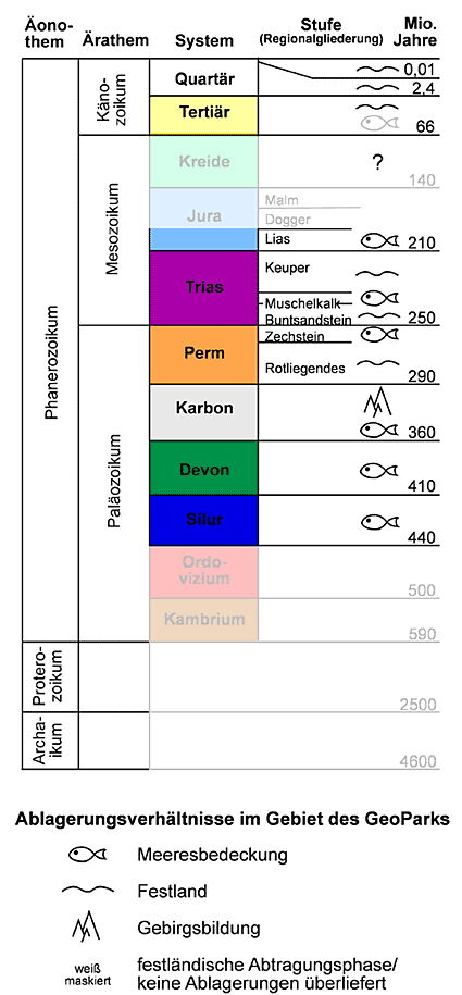 Auch in den nachfolgenden Erdzeitaltern Devon und Karbon war der Geopark von einem Meer bedeckt.